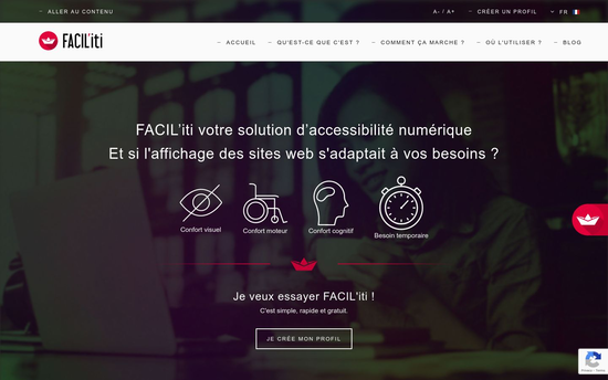 FACIL'iti est une solution d'accessibilité numérique innovante, qui adapte l'affichage d'un site web en fonction de vos besoins de confort visuels, moteur, cognitif et/ou temporaire.